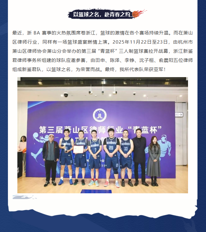 赛场展锋芒!新鉴君所荣获萧山区律师行业“青蓝杯” 三人制篮球赛亚军