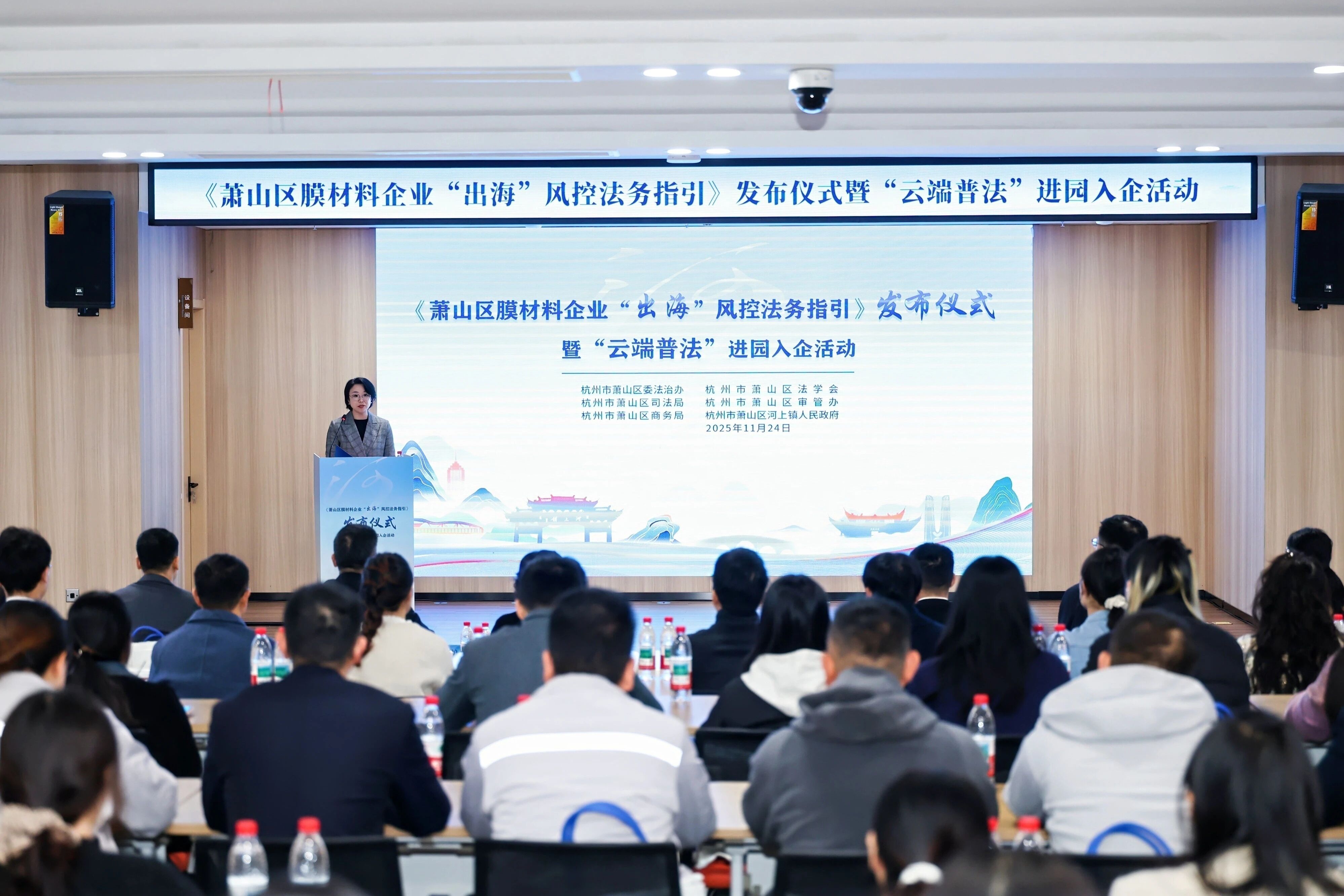 法治是企业稳健发展的基石,合规风控是企业行稳致远的保障。2025年11月24日上午,由萧山区委法治办、区司法局、区商务局、区法学会、区审管办、河上镇人民政府联合举办的《萧山区膜材料企业“出海”风控法务指引》(以下简称“《指引》”)发布仪式暨“云端普法”进园入企活动在河上镇举行。