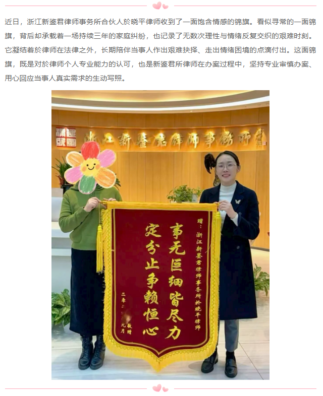 用专业暖人心 新鉴君所合伙人於晓平律师获赠锦旗