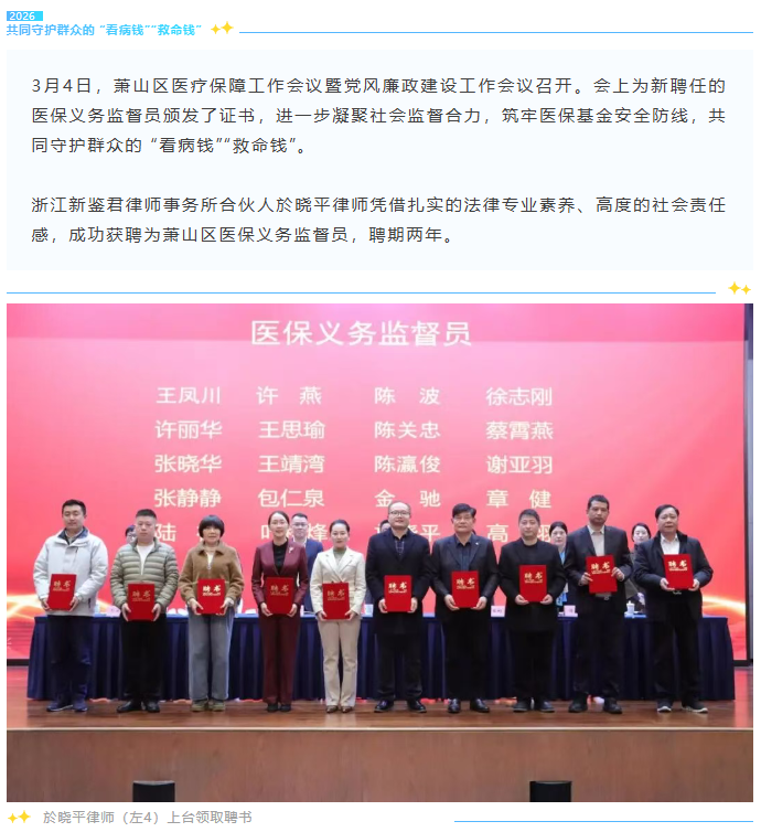 新鉴君所合伙人於晓平律师获聘萧山区医保义务监督员