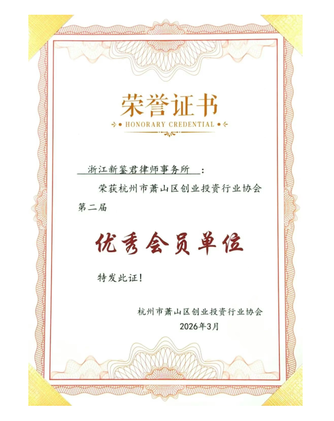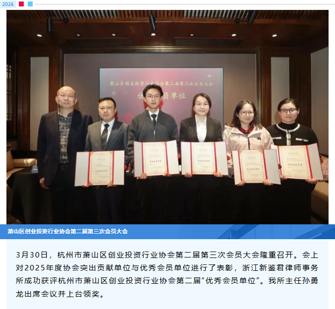 新鉴君所荣获杭州市萧山区创业投资行业协会“优秀会员单位”称号