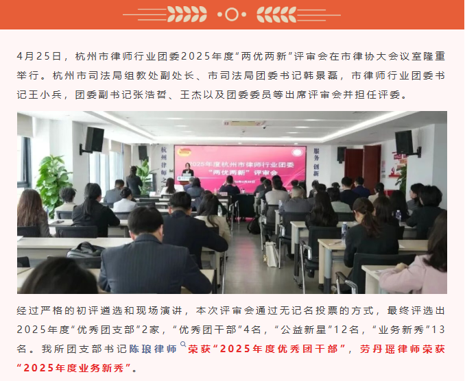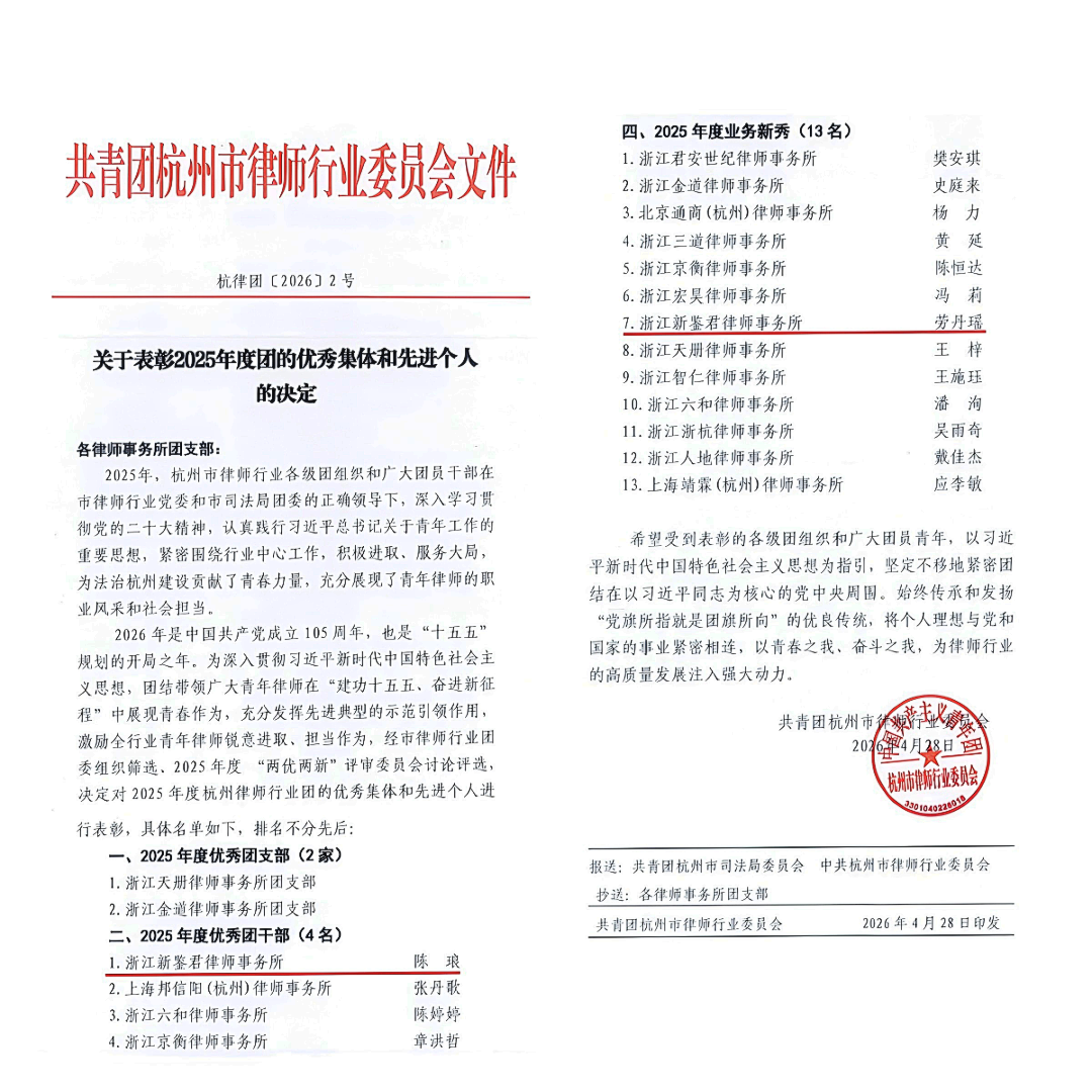 新鉴君所律师荣获2025年度杭州市律师行业团委“两优两新”表彰