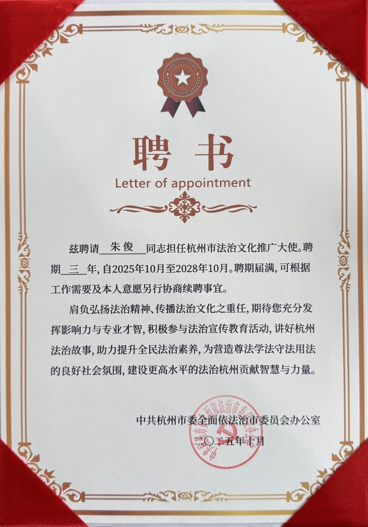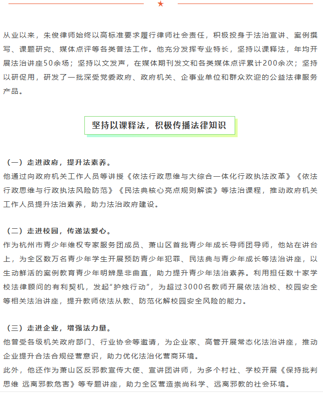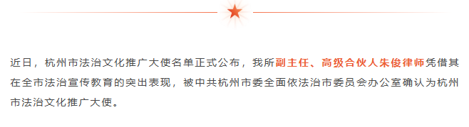 新鉴君所副主任朱俊律师被确认为杭州市法治文化推广大使