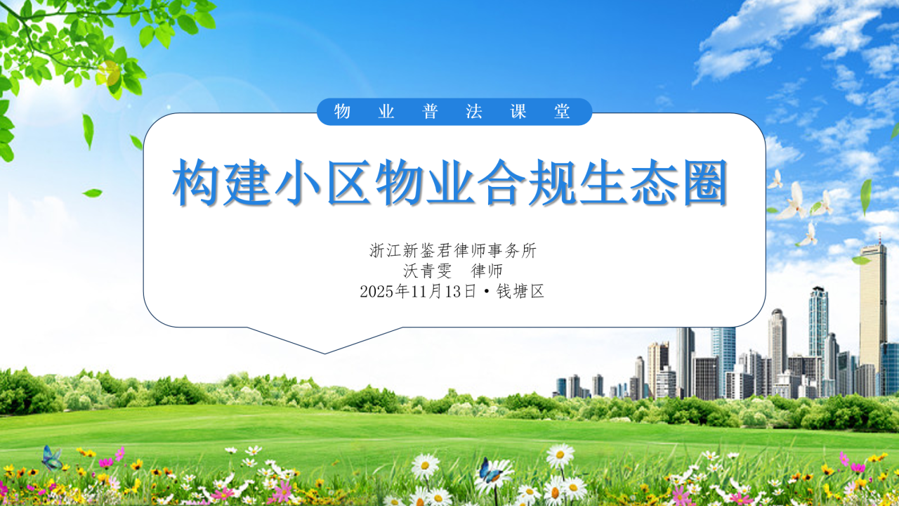 为助力钱塘区构建规范有序的物业管理生态,推动基层治理法治化进程,化解业主、业委会、社区与政府之间的多方矛盾,2025年11月13日上午,浙江新鉴君律师事务所合伙人沃青雯律师应钱塘区住建局邀请参加“钱塘论建” 系列活动,以“构建小区物业合规生态圈”为主题,为相关工作人员等开展专题普法培训。