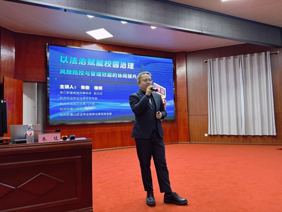 11月17日下午,我所副主任朱俊律师应萧山区靖江初级中学邀请,为全体教师作关于《以法治赋能校园治理——风险防控与管理效能的协同提升》专题法治讲座。