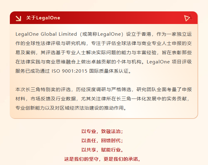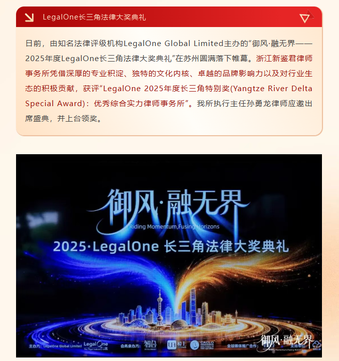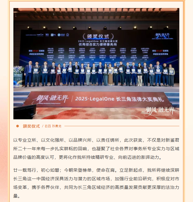 新鉴君所获评“LegalOne 2025年度长三角特别奖:优秀综合实力律师事务所”