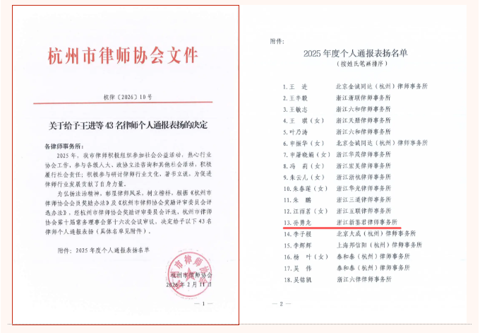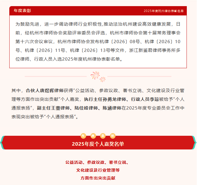 新鉴君所多位律师和行政人员入选2025年度杭州律协表彰名单