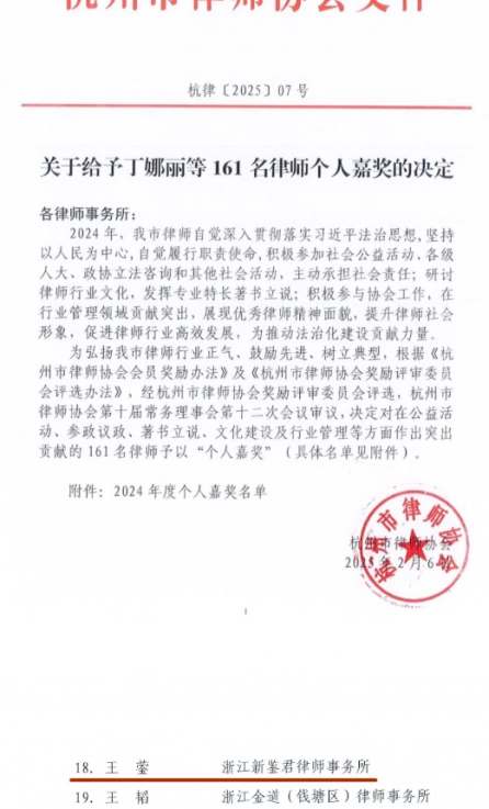 王蓥荣获杭州市律师协会“个人嘉奖”