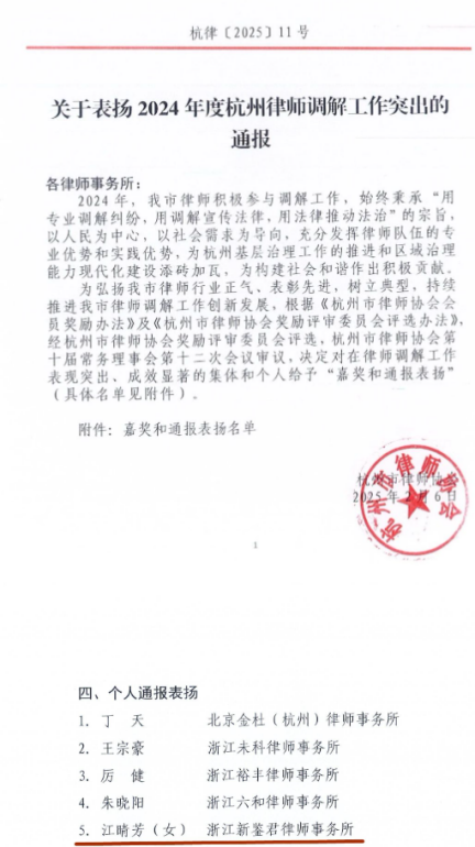江晴芳荣获杭州市律师协会2024年度杭州律师调解工作室突出“个人通报表扬”