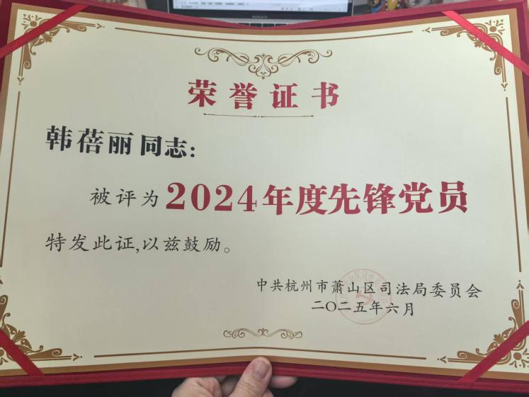 韩蓓丽荣获杭州市萧山区司法局委员会“2024年度先锋党员”